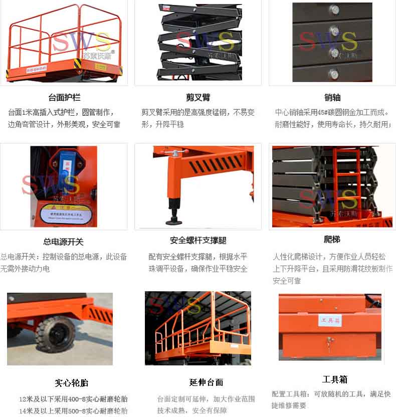 剪叉式主體結構和伸縮工作臺、以及安全護欄;