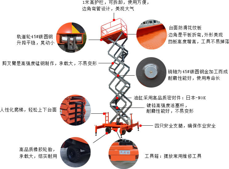 產品描述: 適用于廠房、工地、賓館、倉庫、機場、車站、碼頭、體育場等高大建筑之高空設備安裝、檢修和清潔衛生,野外電力設施、高架管道、起吊機械維護保養等高空作業。